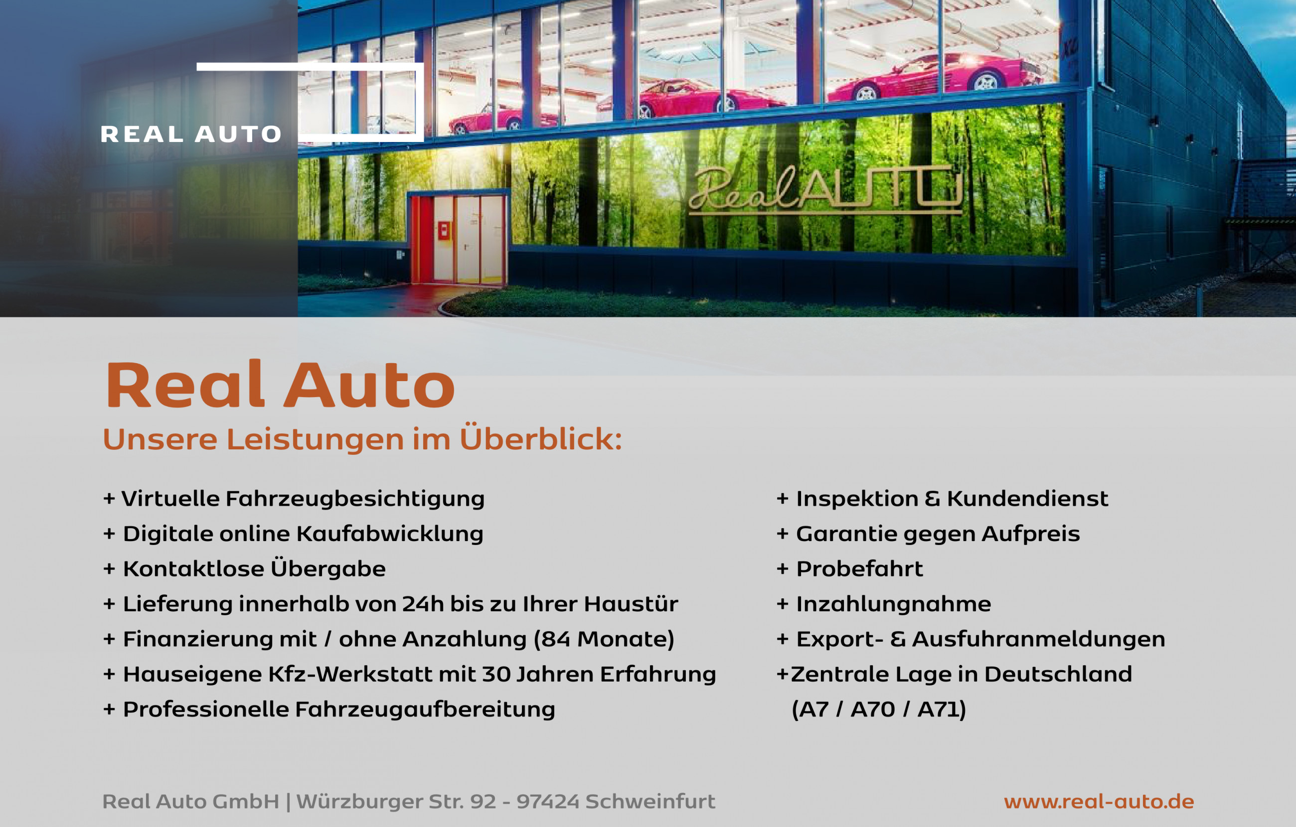 - Wünschen Sie eine Probefahrt mit Ihrem Wunschfahrzeug? Sehr gerne! Terminvorschläge nehmen wir unter Telefon: +49 (0) 9721 33033 oder auch per E-Mail an info@real-auto.de entgegen. Wir freuen uns auf Sie!